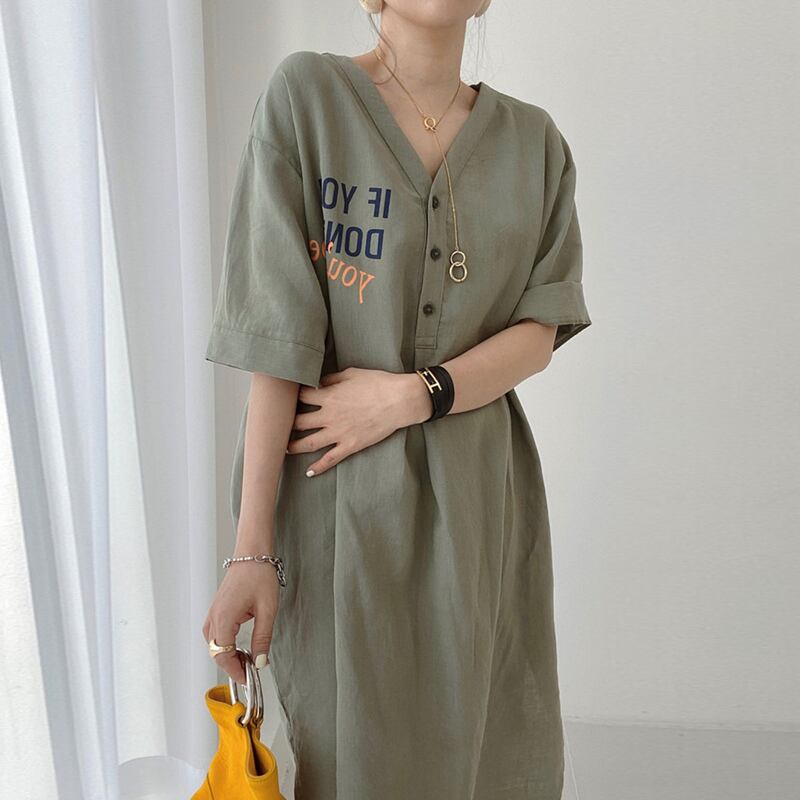 Vネックが顔まわりをすっきりと見せて、抜け感のある印象に仕上げたワンピース。