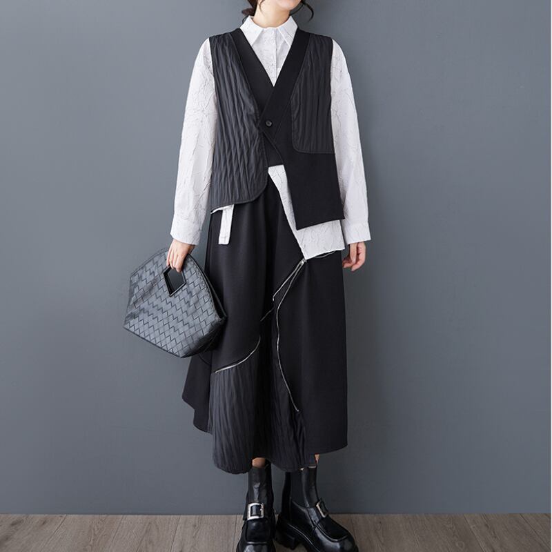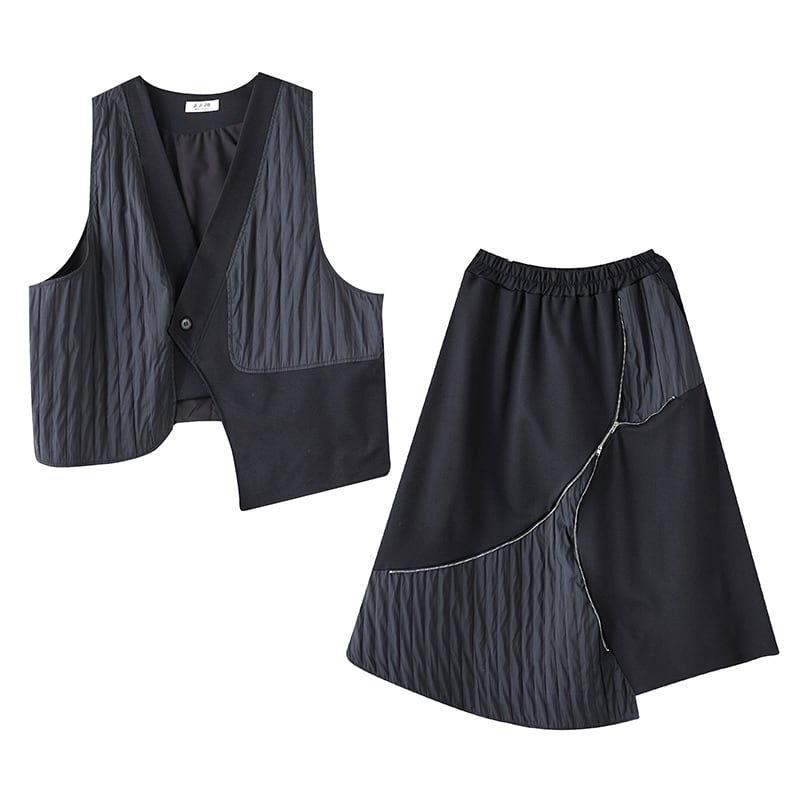 Vネックベストとアシンメトリーロングスカートのセットアップ。