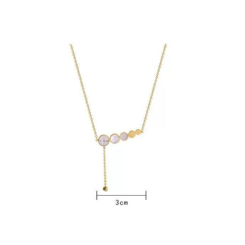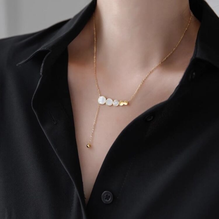 上品な光沢を放つホワイトシェルモチーフが、首元にさりげない華やかさをプラスします。