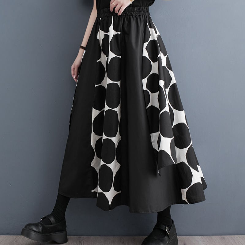ドット柄と無地の切替がスタイリッシュなマキシ丈スカート。