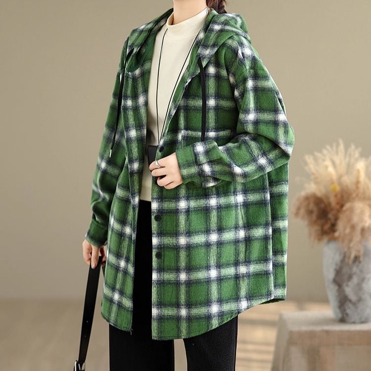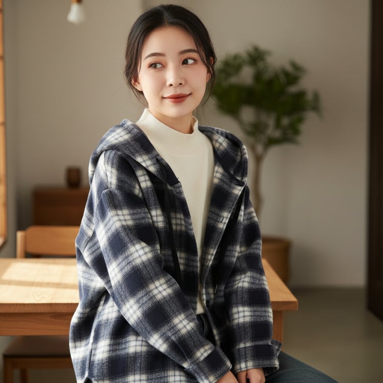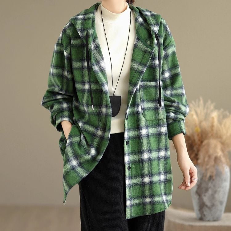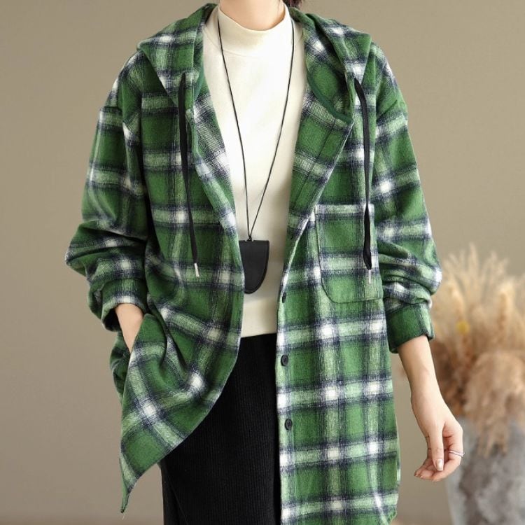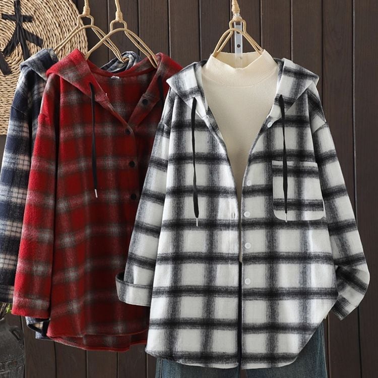 チェック柄ドローストリングフード付きシャツ(4色)11097