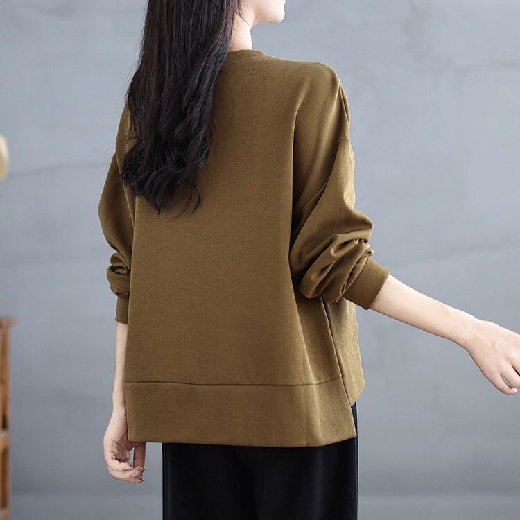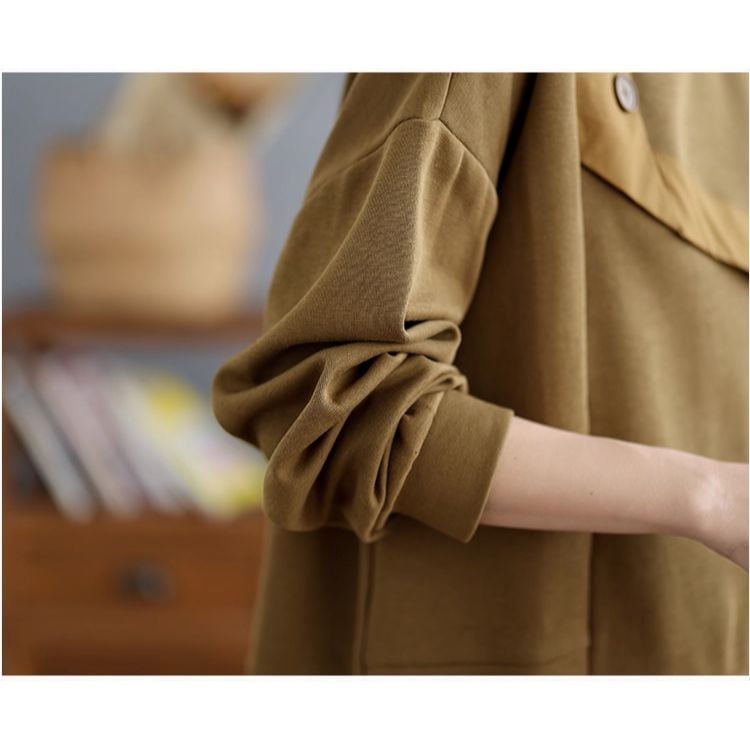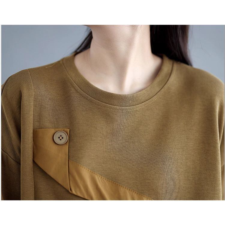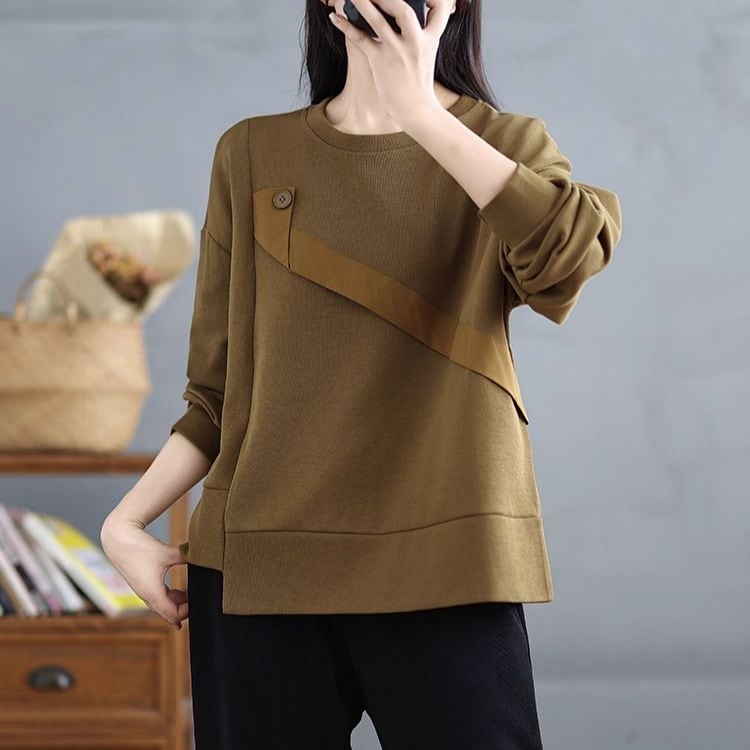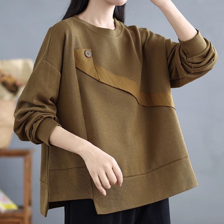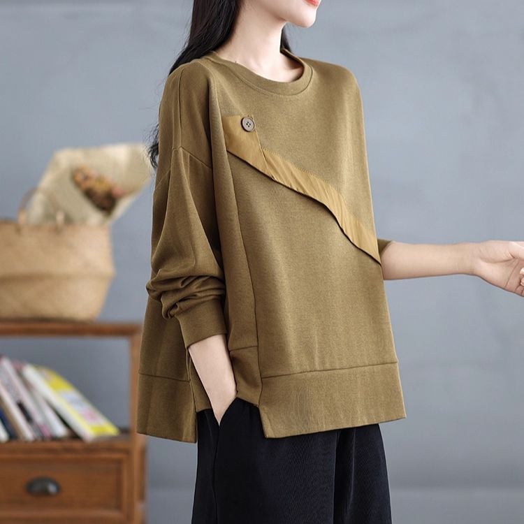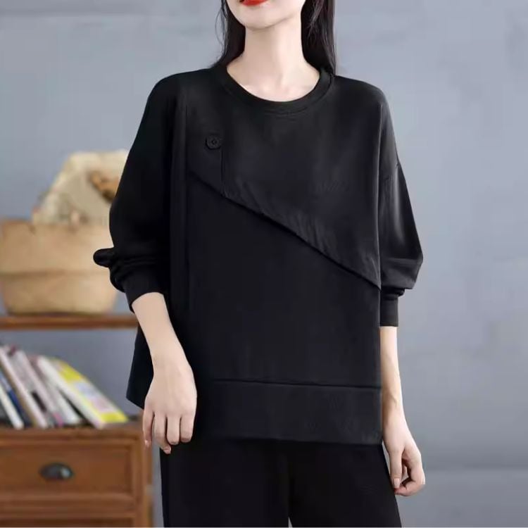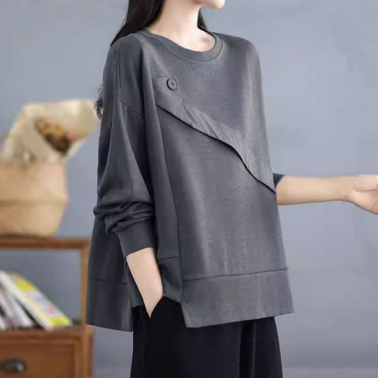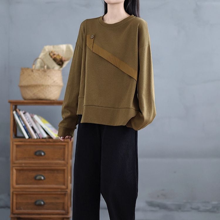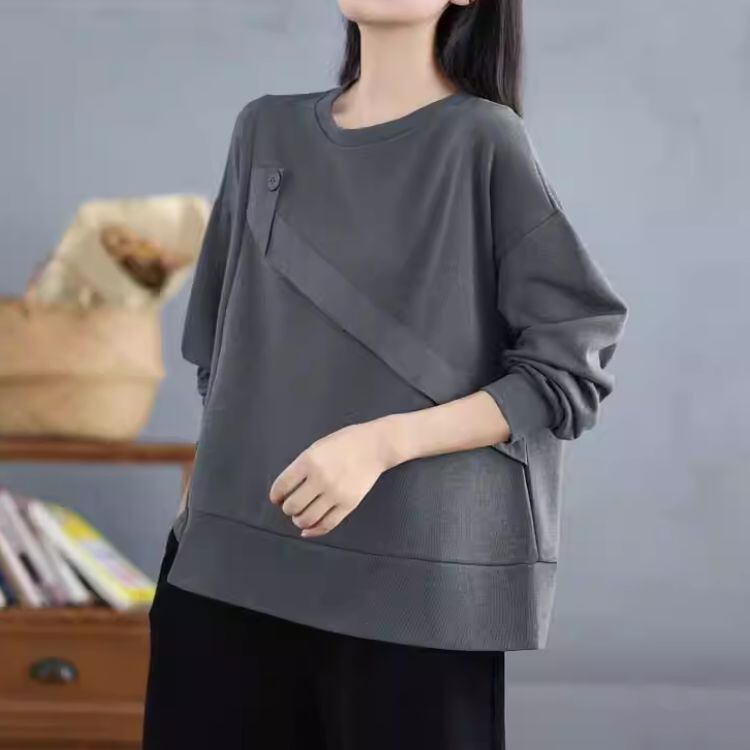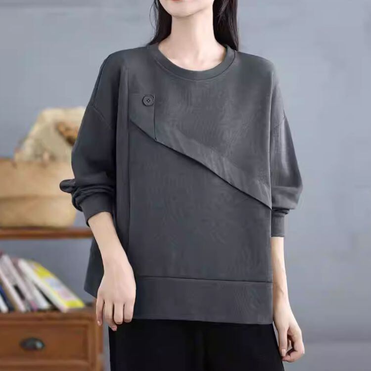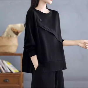胸元の斜め切り替えとワンボタンが、さりげなく個性を添えるスウェットトップスです。
