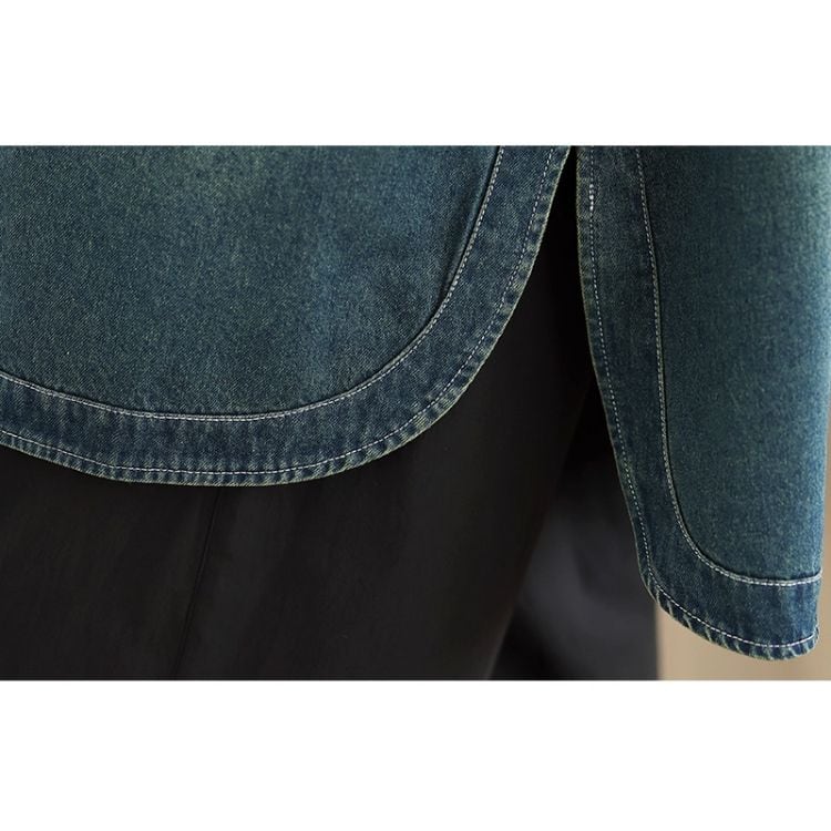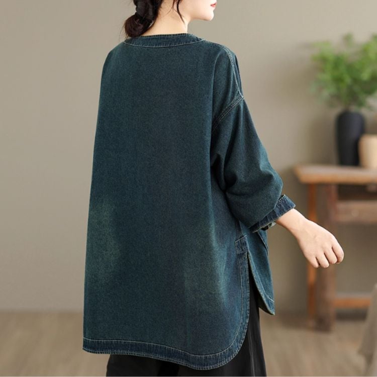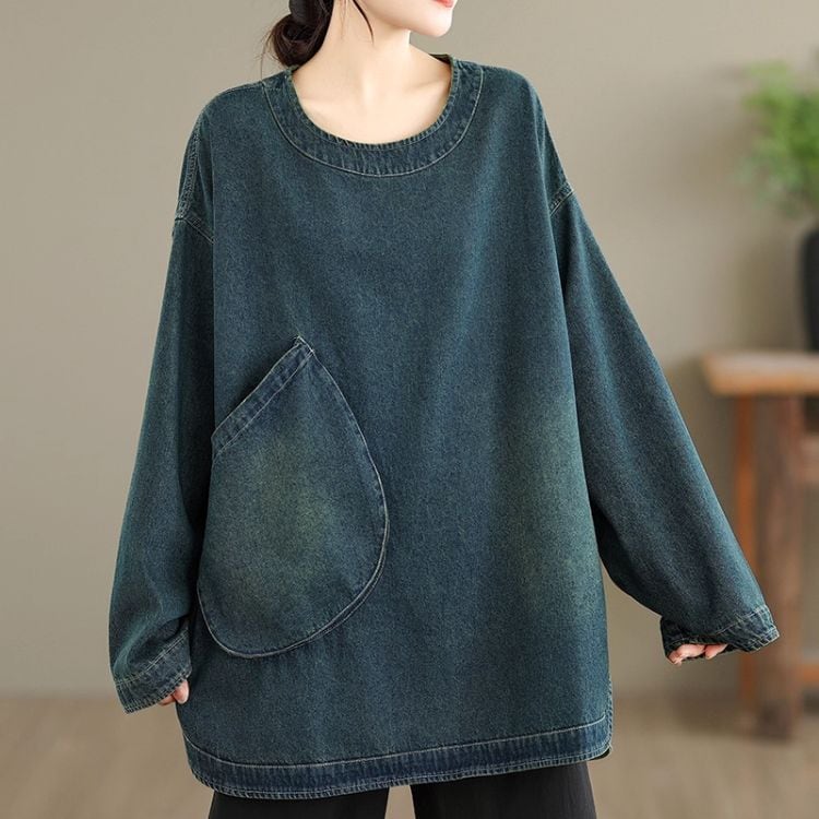 大きめのラウンドポケットが目を惹く、やわらかな雰囲気のデニムトップス。