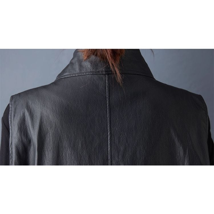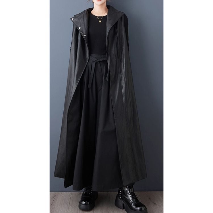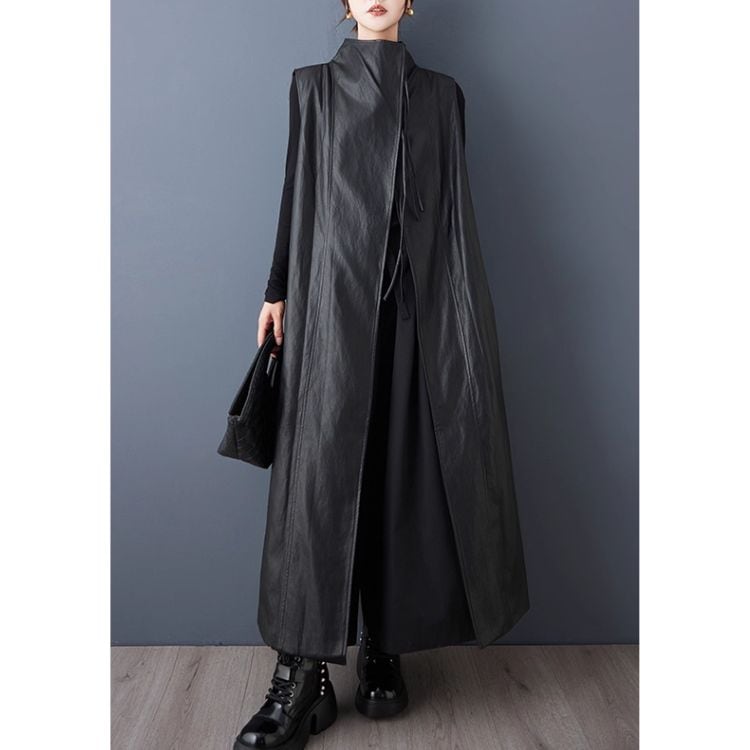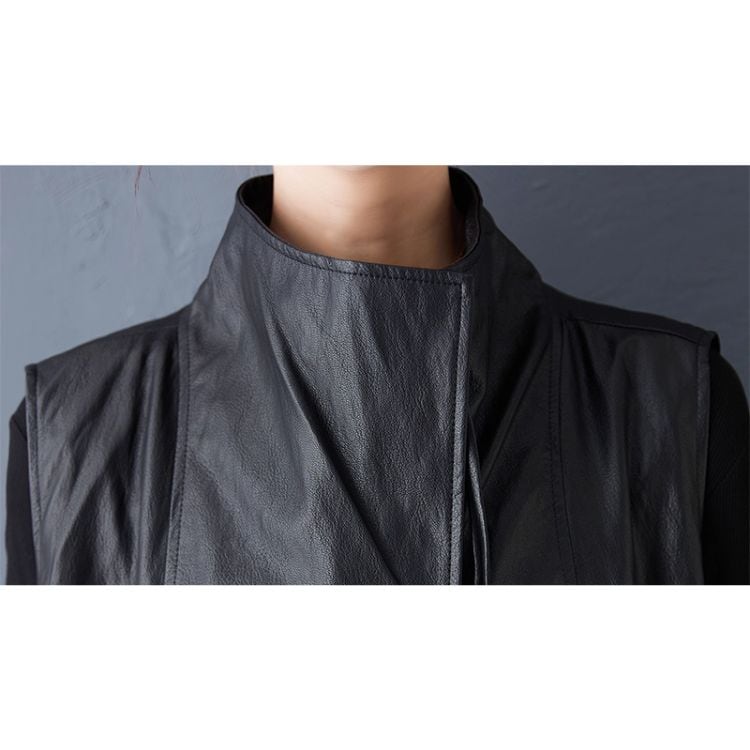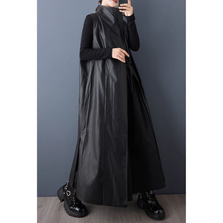 ロング丈のジレシルエットにフェイクレザーを合わせ、すっきりとした縦ラインを演出。