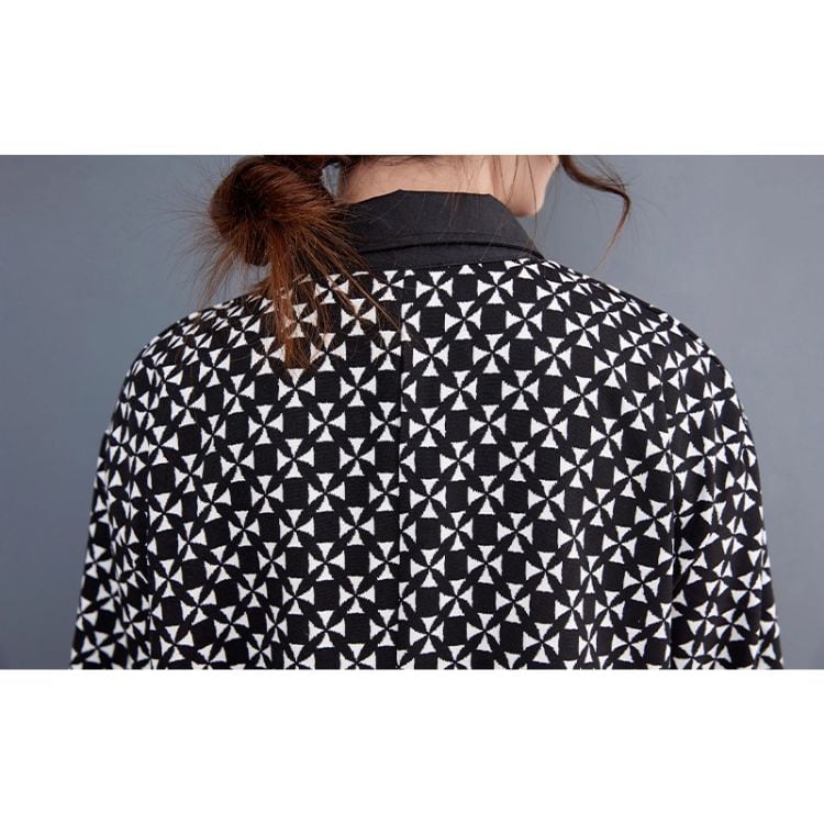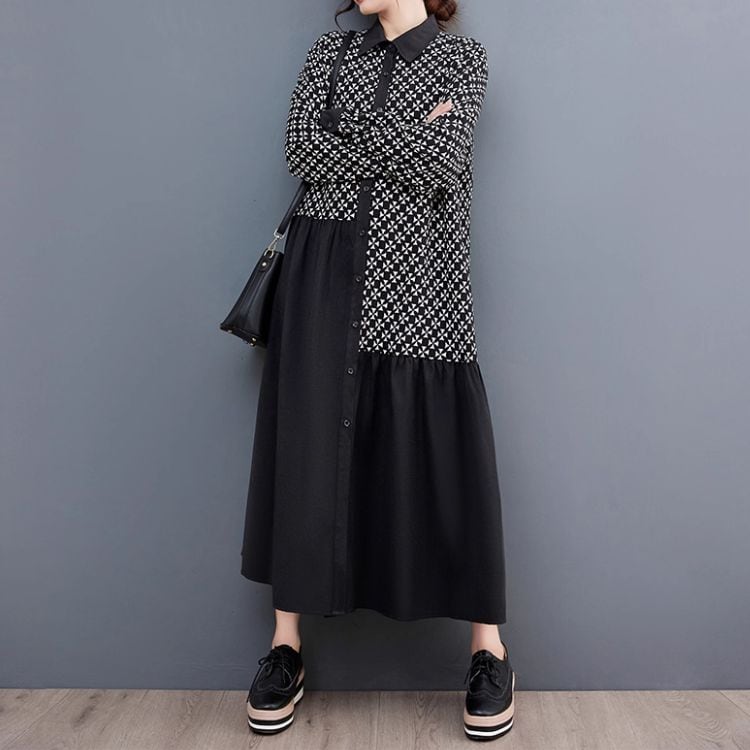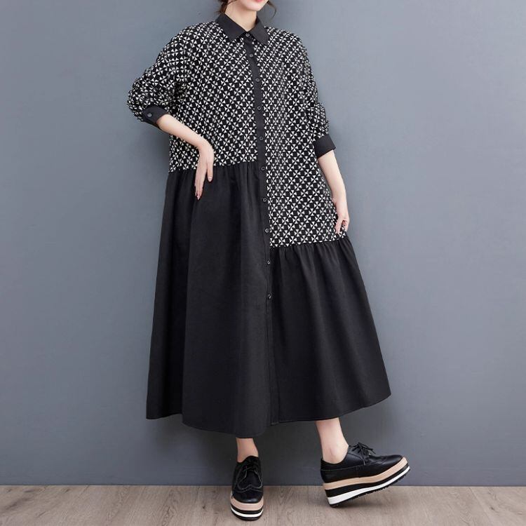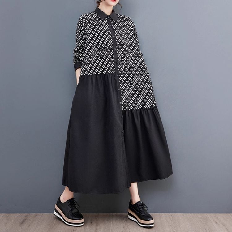 上身頃に施したドット調の柄と、アシンメトリーに切り替えたスカートが印象的な一枚です。