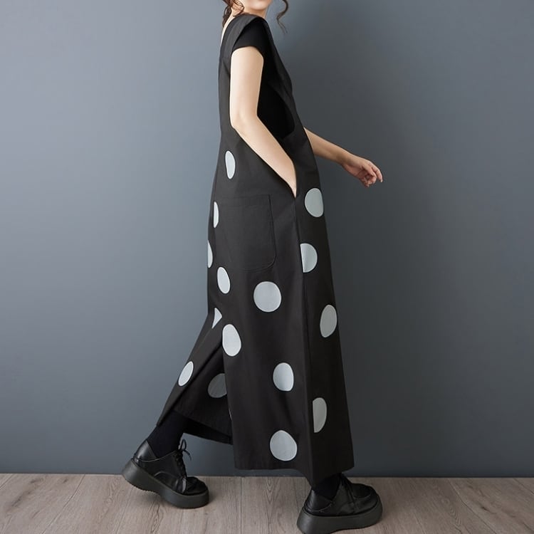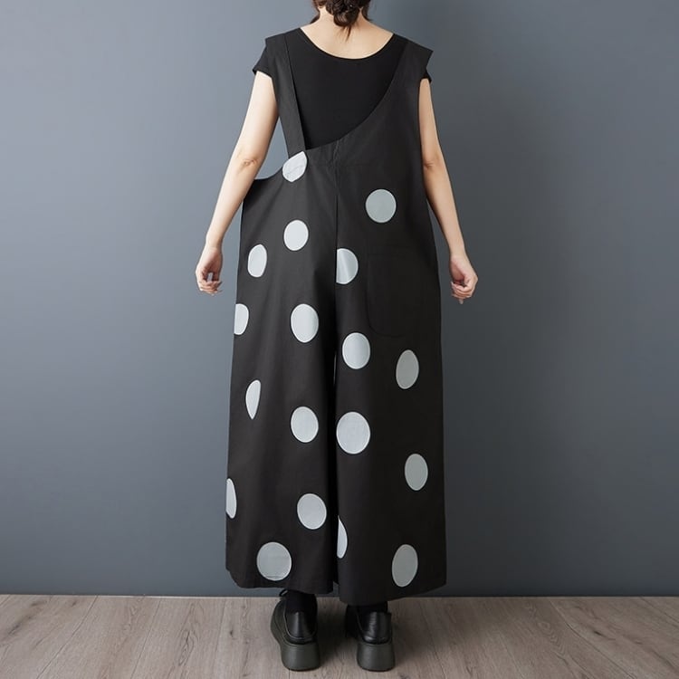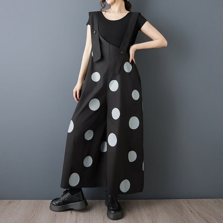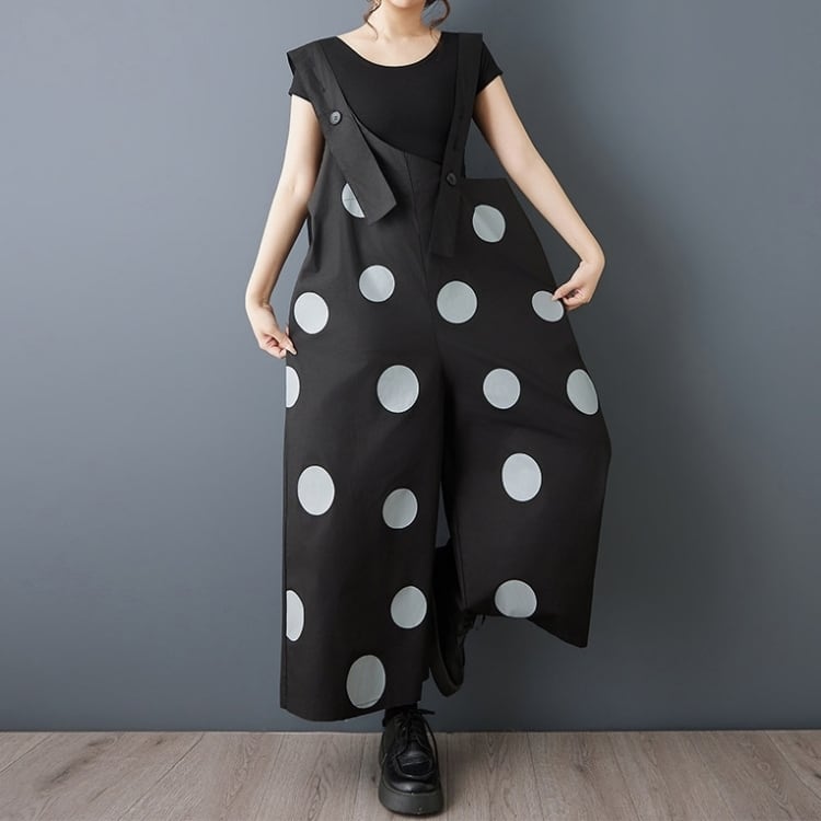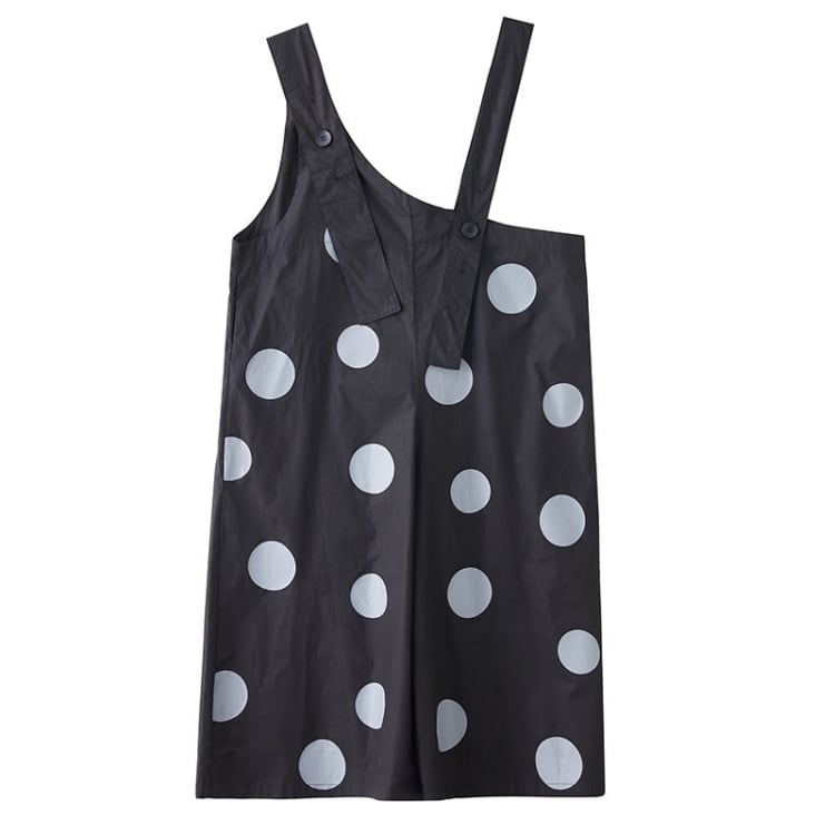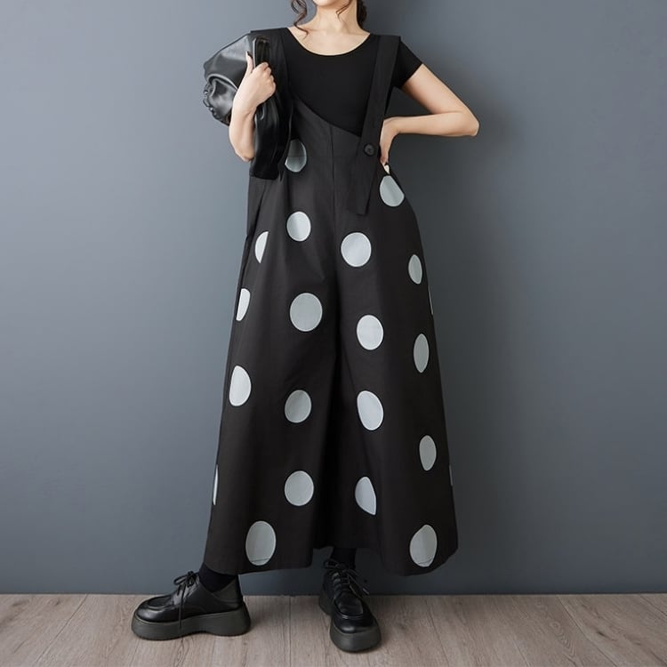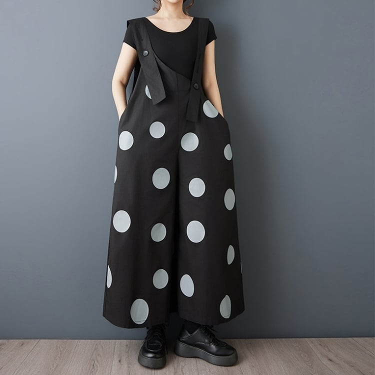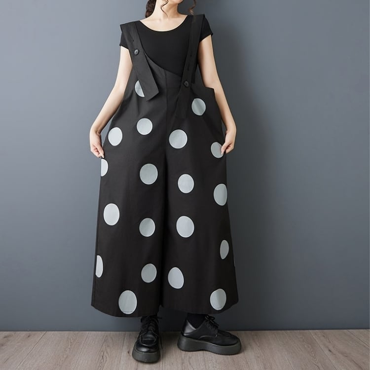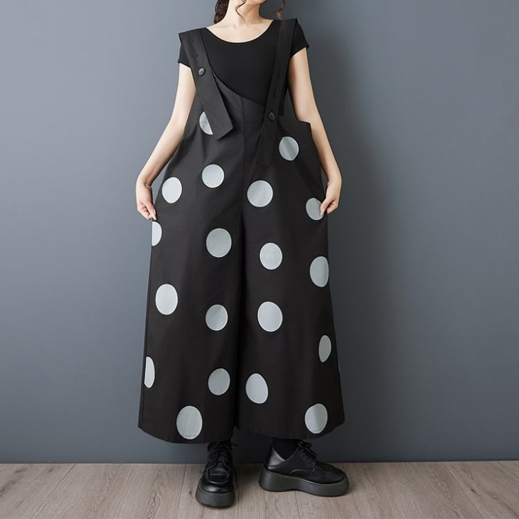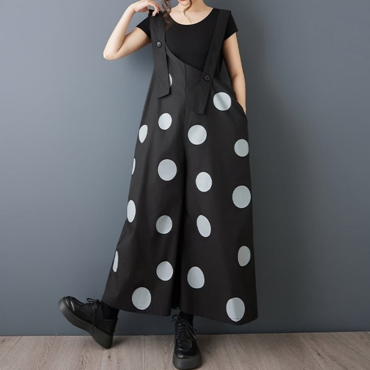 大胆なドット柄が目を引くワイドシルエットのサロペット。斜めに重なるデザインと太めのストラップが、ほどよい個性を添えます。