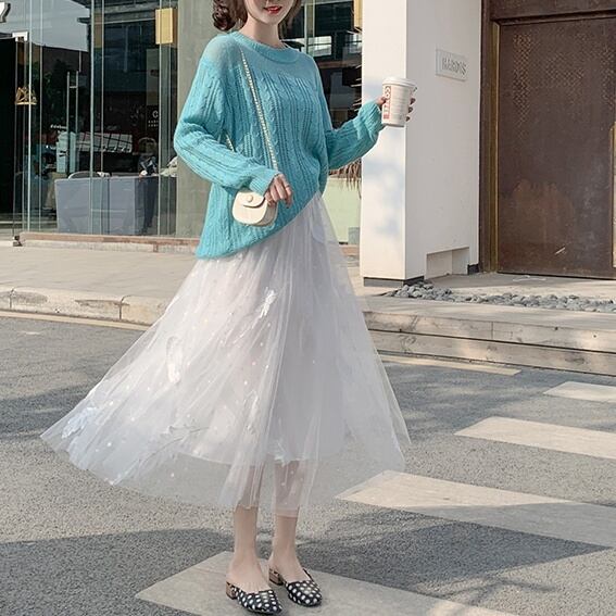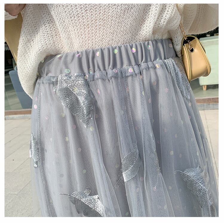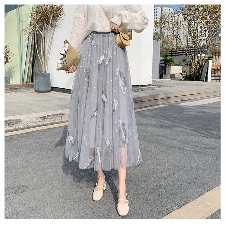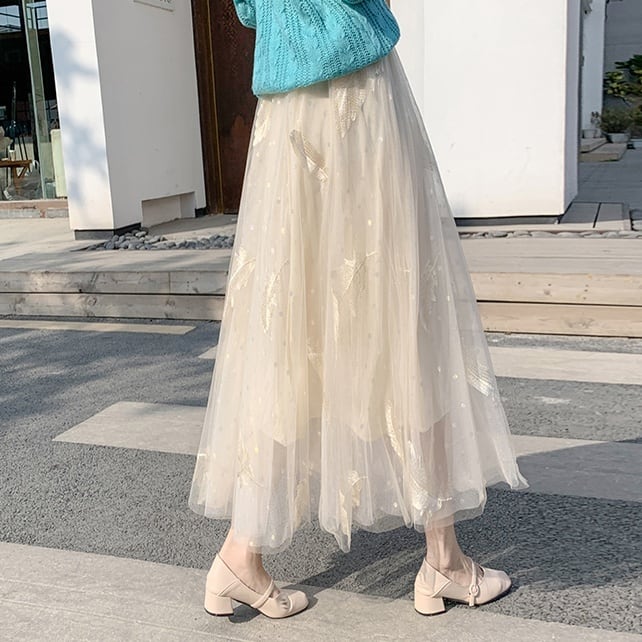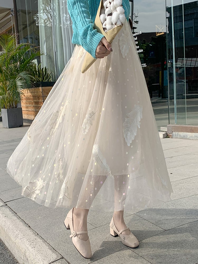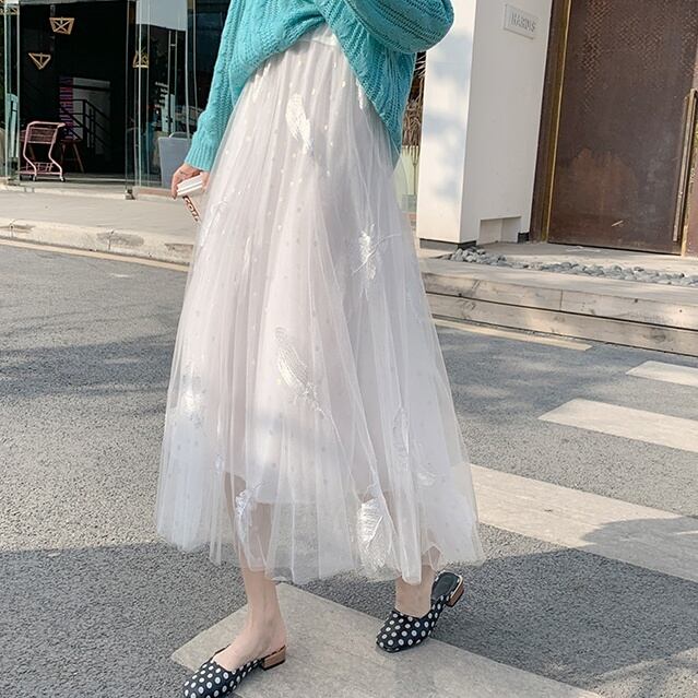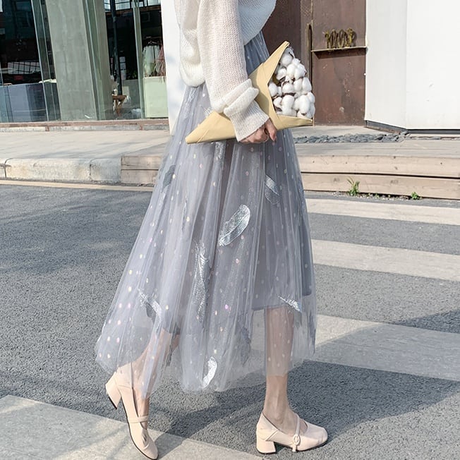 幼く見えがちなチュールスカートが羽の刺繍でグッとエレガントな印象に。