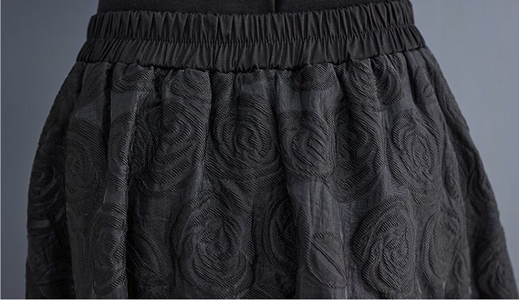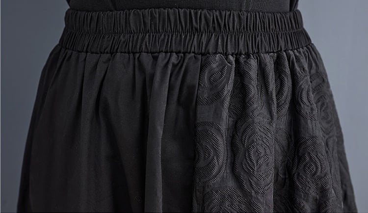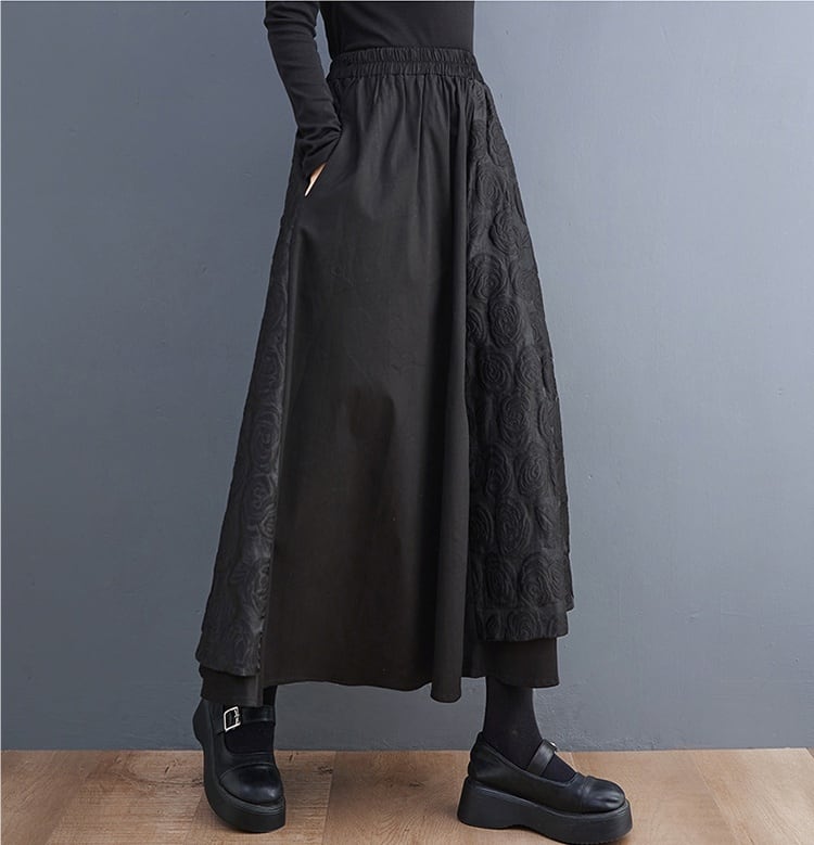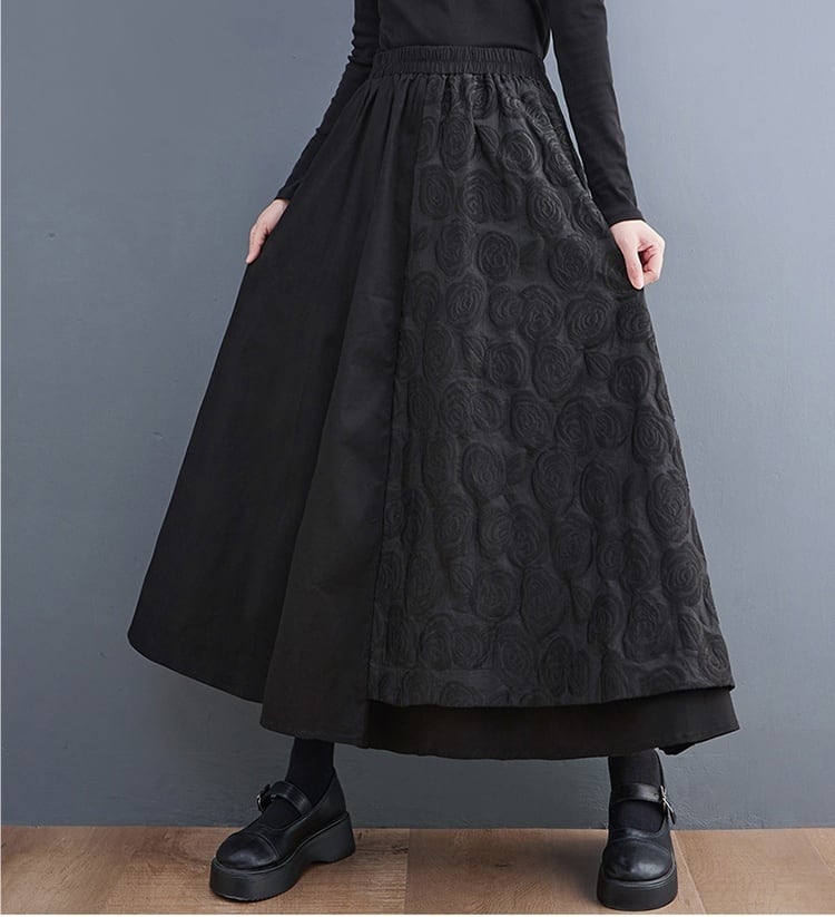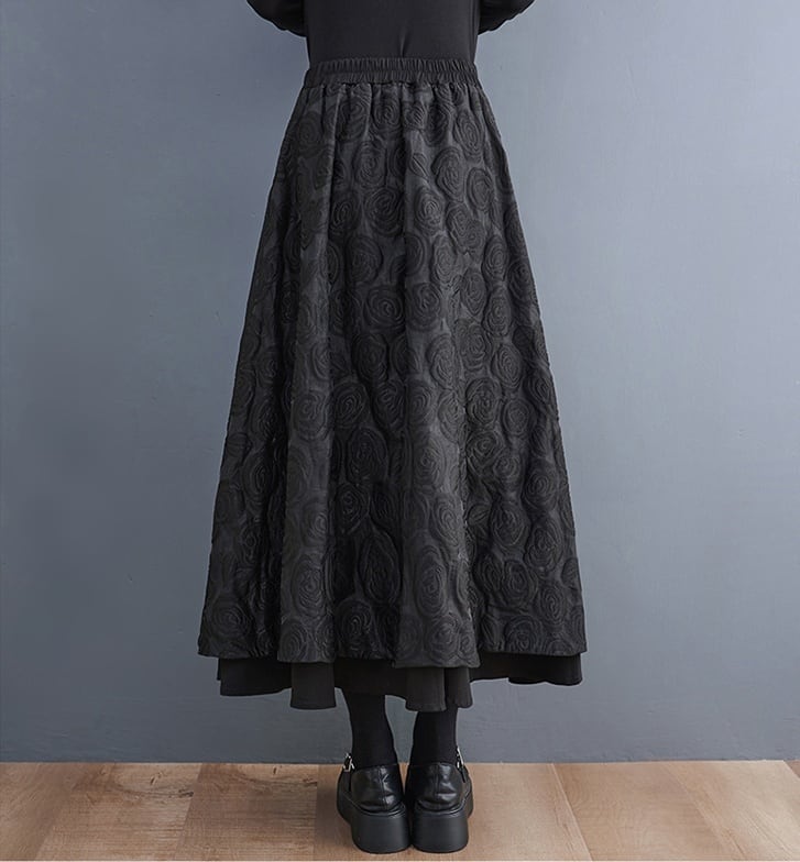 黒一色のロングスカートもエンボス加工の花柄で重く見えないデザインに。