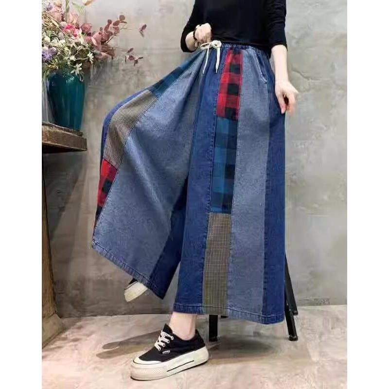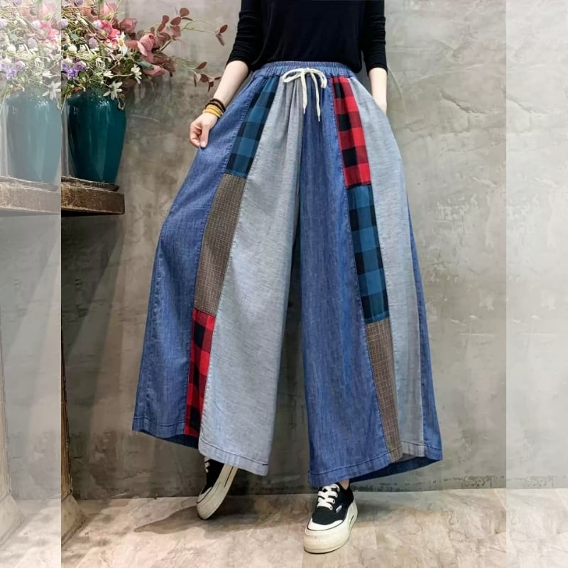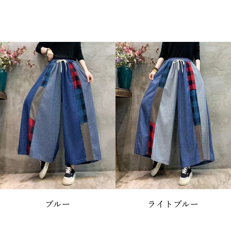 チェック柄が印象的なパッチワークのワイドパンツです。