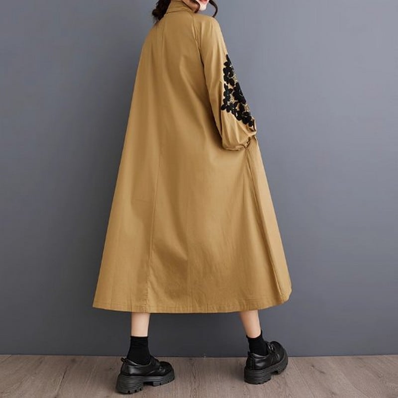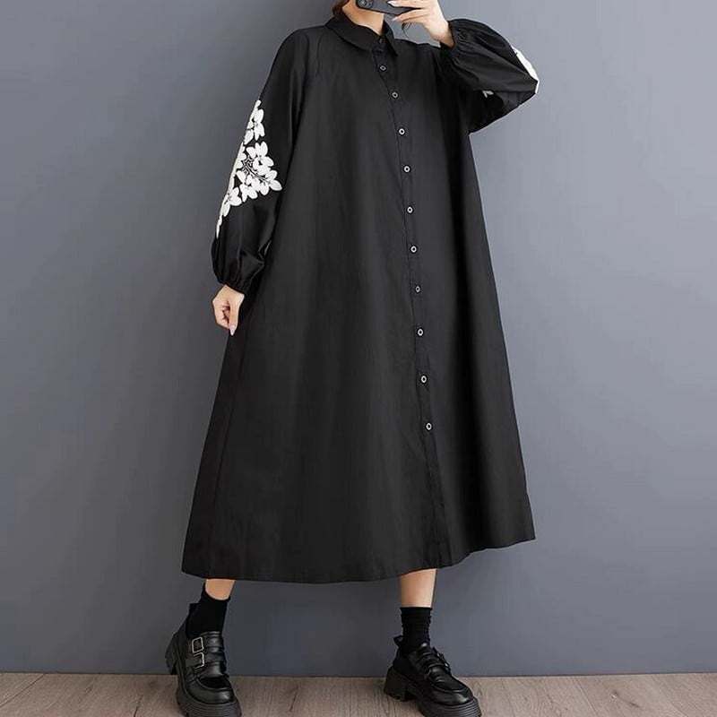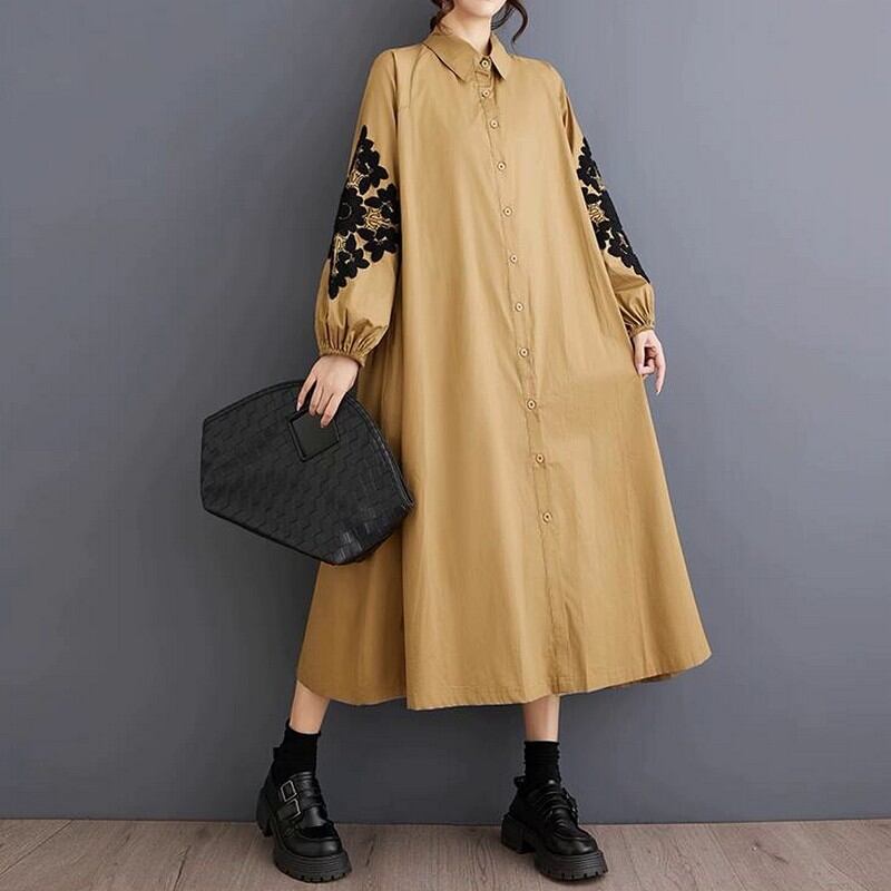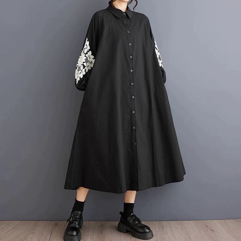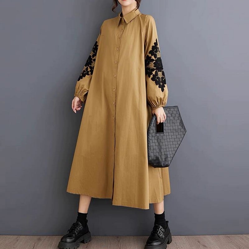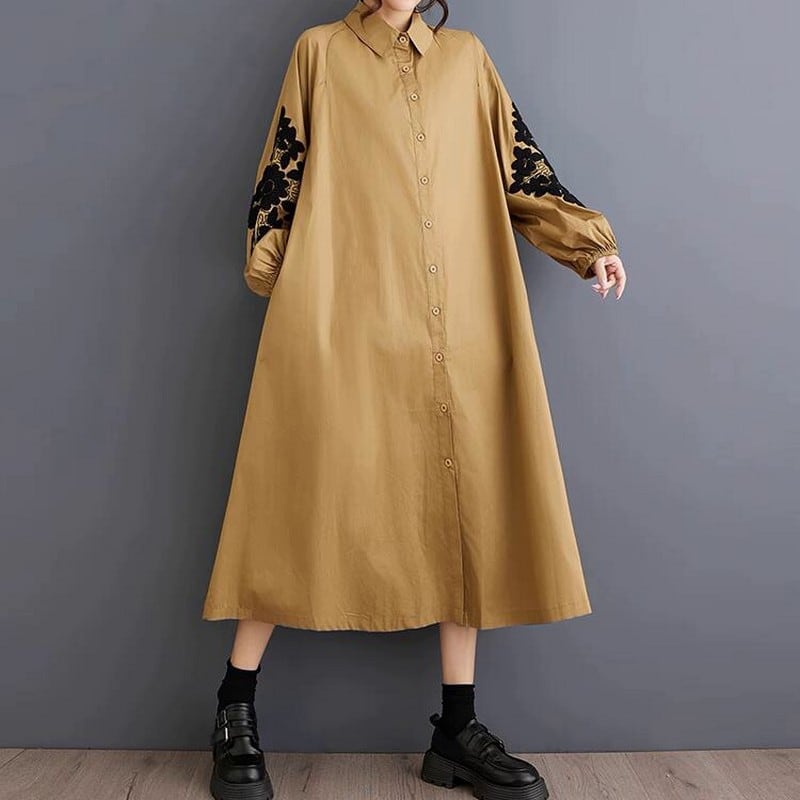 袖に繊細な刺繍が施されたワイドシルエットのシャツワンピース。
