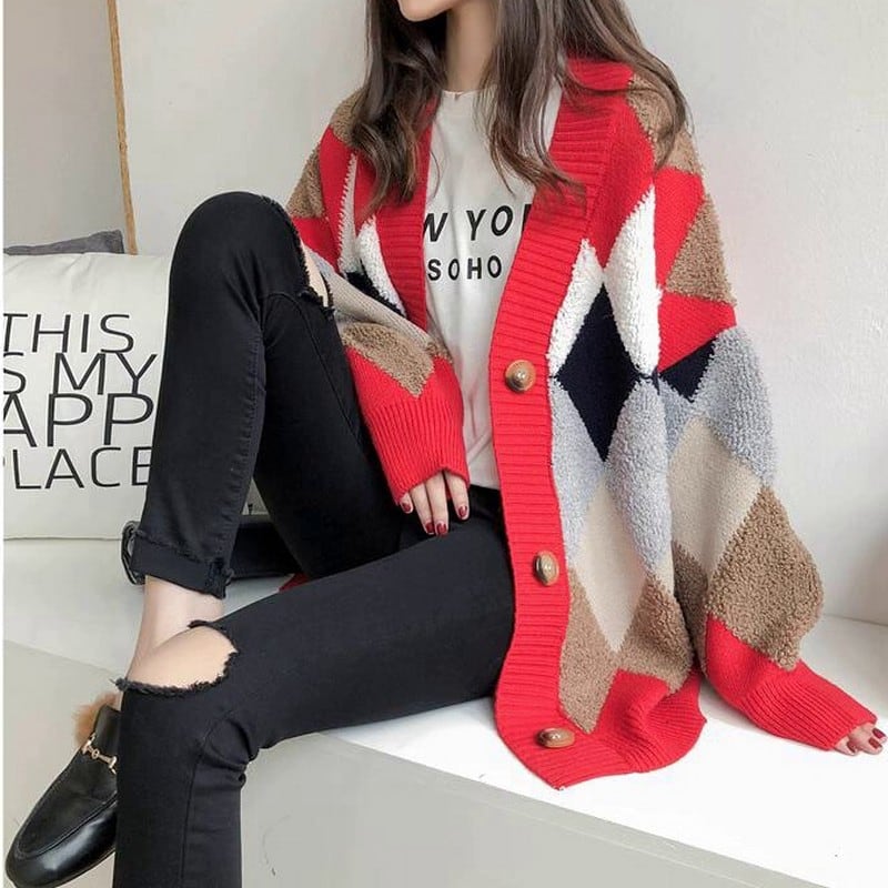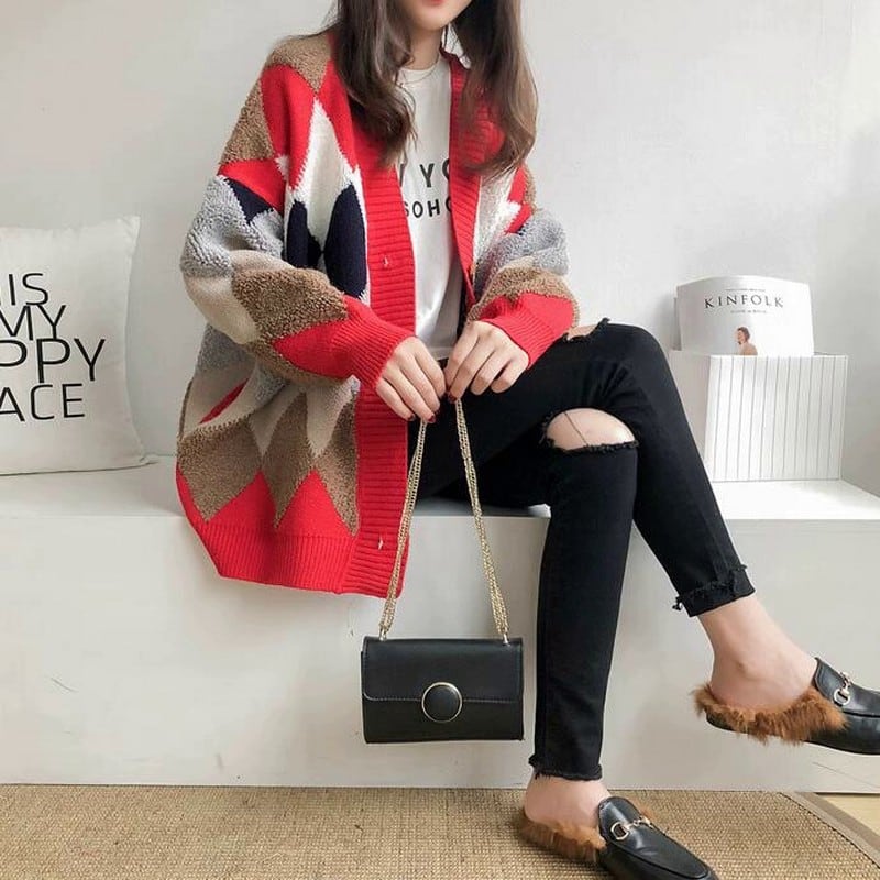 アーガイル柄が目を引くオーバーサイズカーディガン。