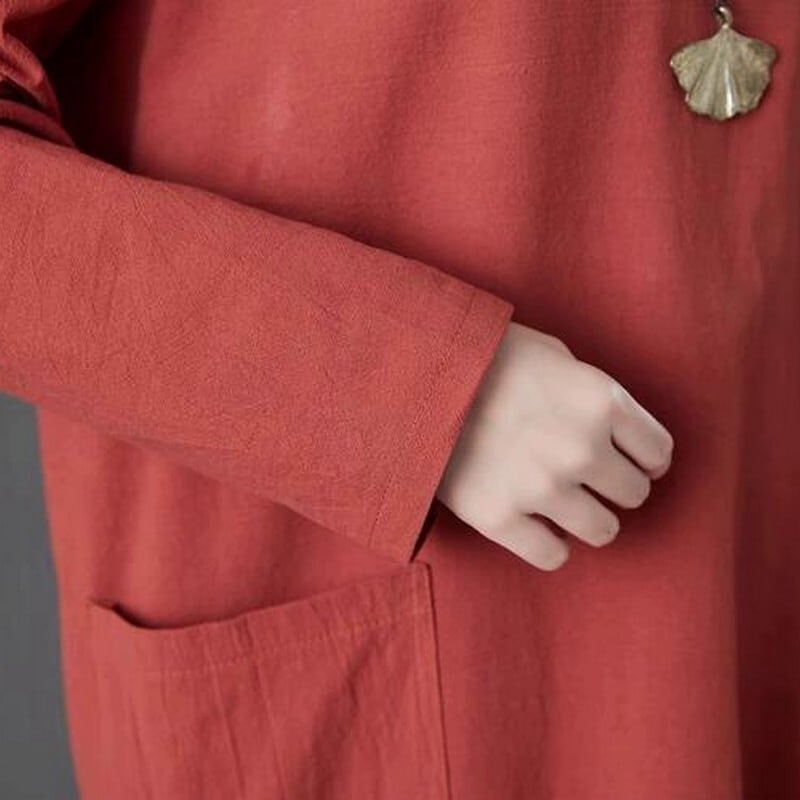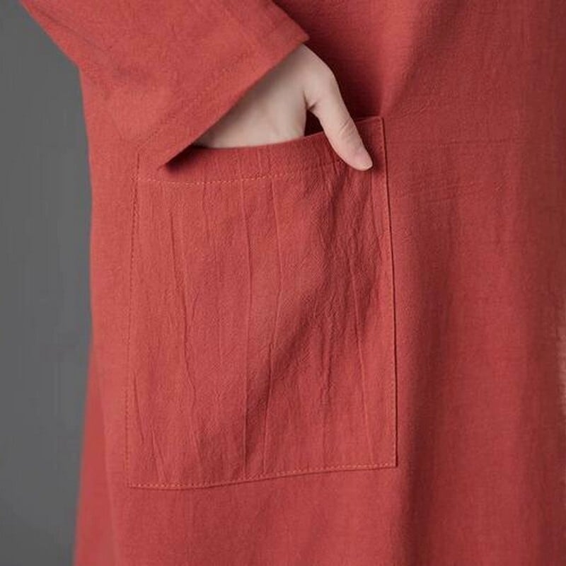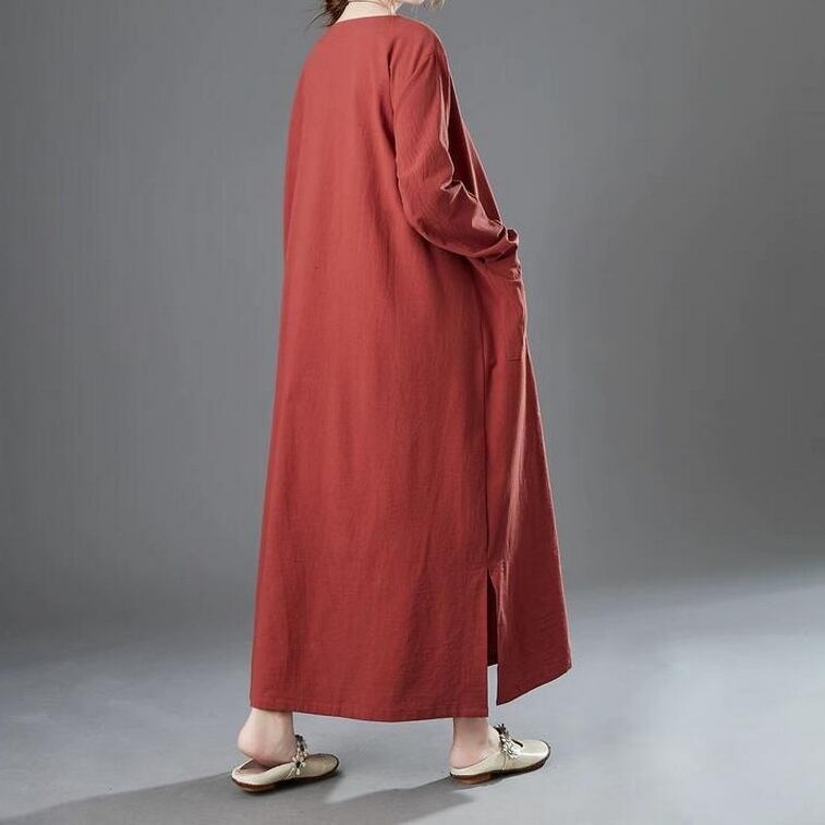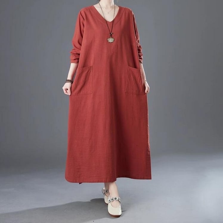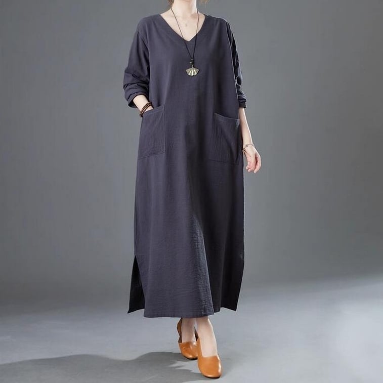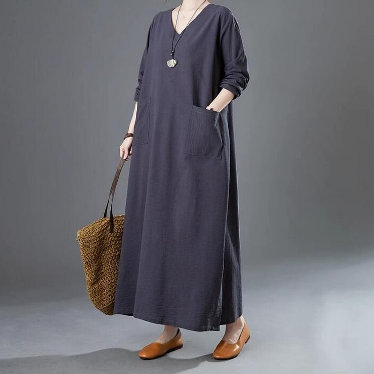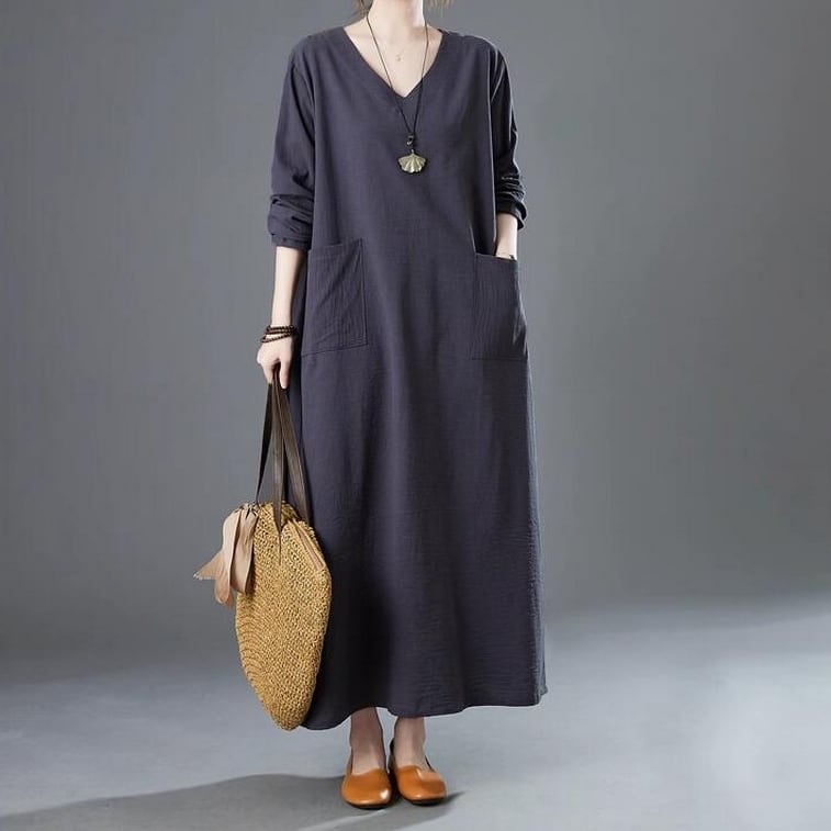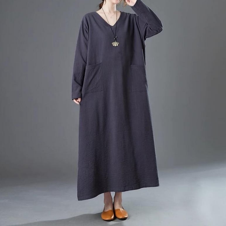 ゆったりとしたシルエットとVネックデザインが特徴のワンピース。