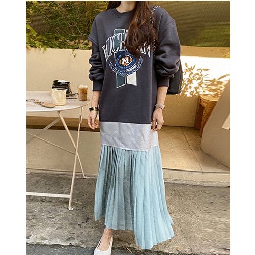ゆったりとしたロゴ入りスウェットと、軽やかなプリーツスカートが合わさったワンピースです。