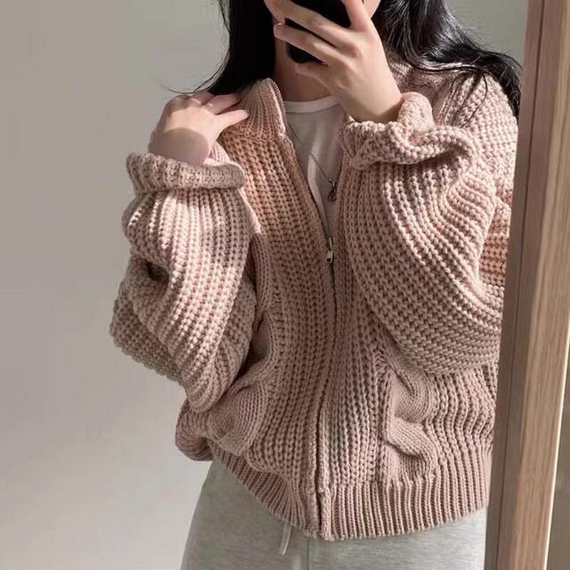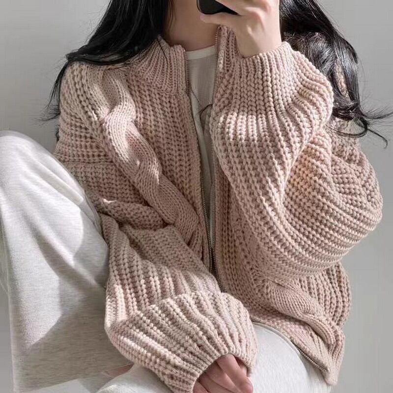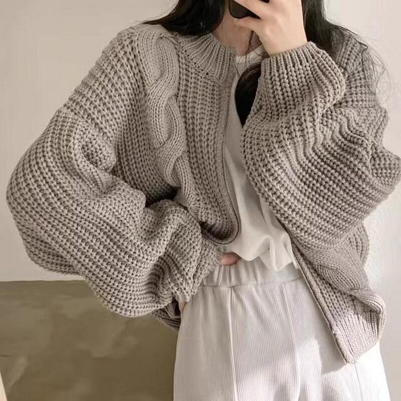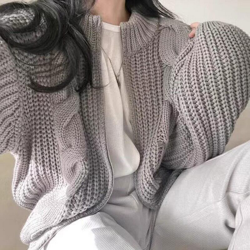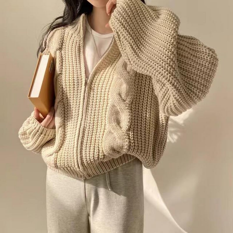 立体的なケーブル編みが特徴のゆったりシルエットのニットジップカーディガンです。